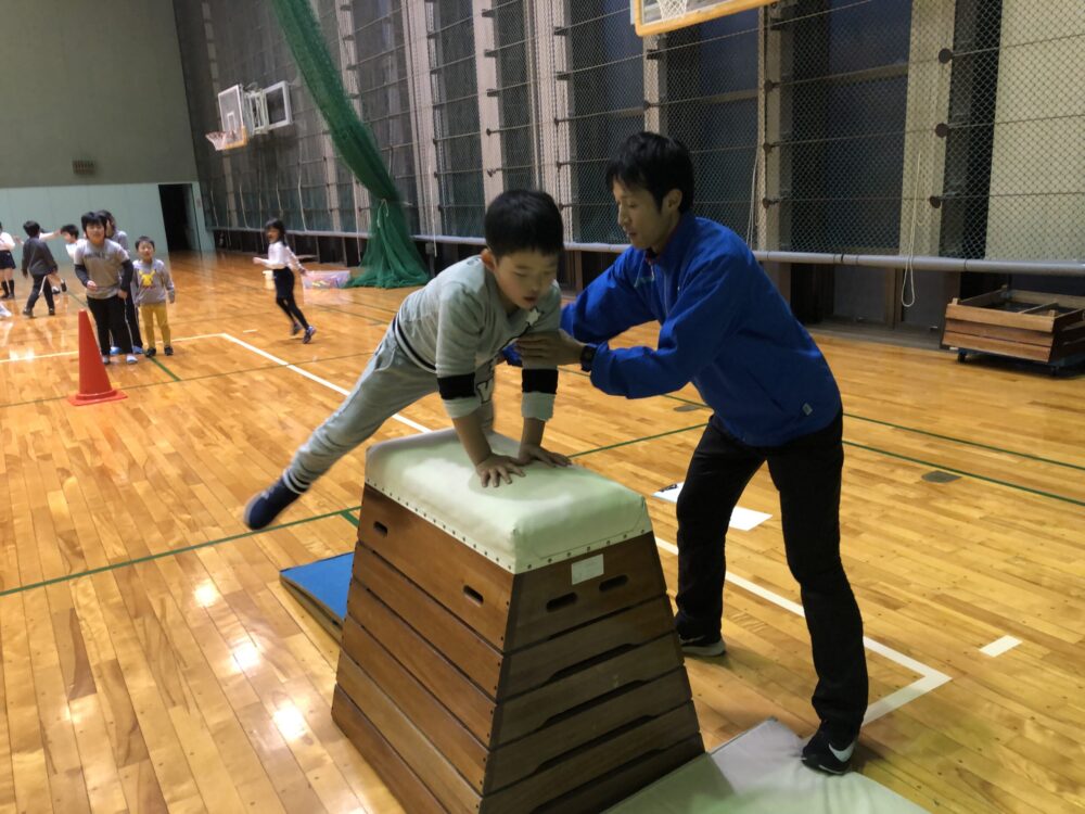 基本メニューはトランポリン・マット運動・跳び箱・鉄棒を指導します。